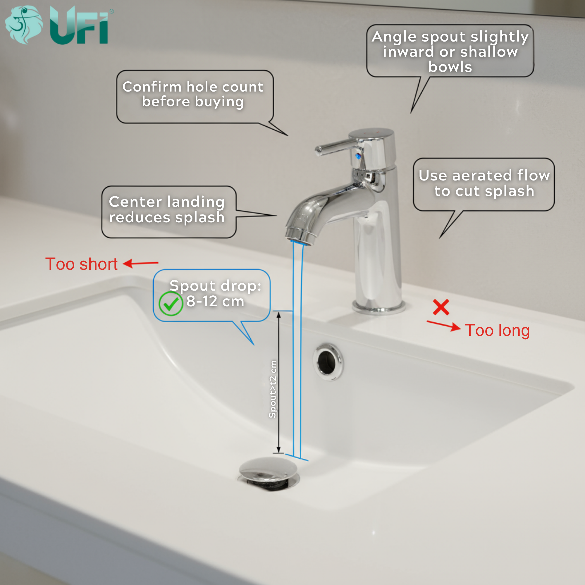 Spout height: For counter basins, keep the drop from spout to water surface around 8–12 cm; taller taps increase splash unless the bowl is deep.